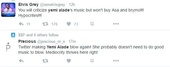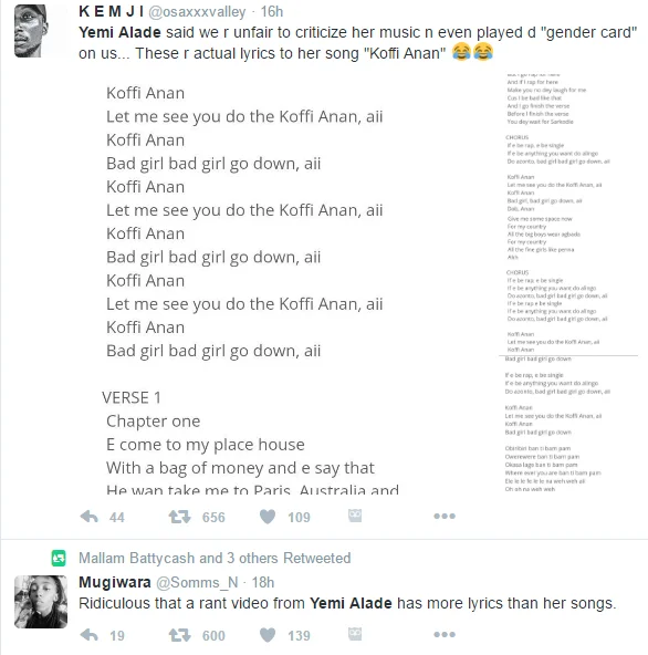 Singer Yemi Alade has been trending on Twitter for almost two days now after she lashed out at fans for criticizing her lyrics Nigerian Bulletin reports.